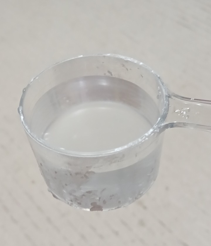 투명한 계량 한컵 가득 모델링팩에 40ml물을 넣고 잘 섞어주면 적당한 질감의 모델링팩이 만들어져요!