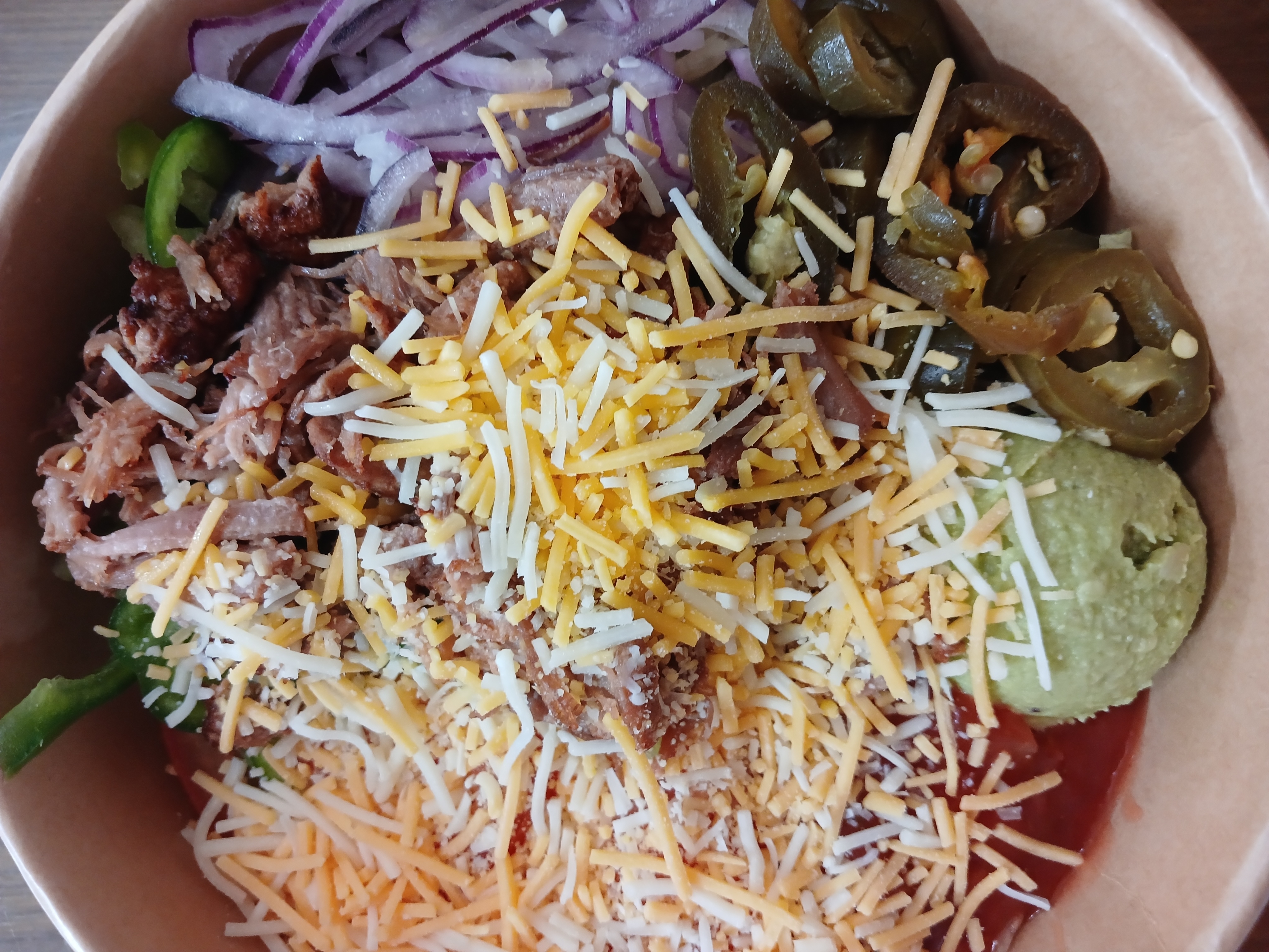 써브웨이 폴드포크 타코 샐러드에는 슈레드 치즈, 아보카도, 할라피뇨, 폴드포크(돼지고기), 살사소스, 양상추, 양파, 피망이 들어가 있어요!