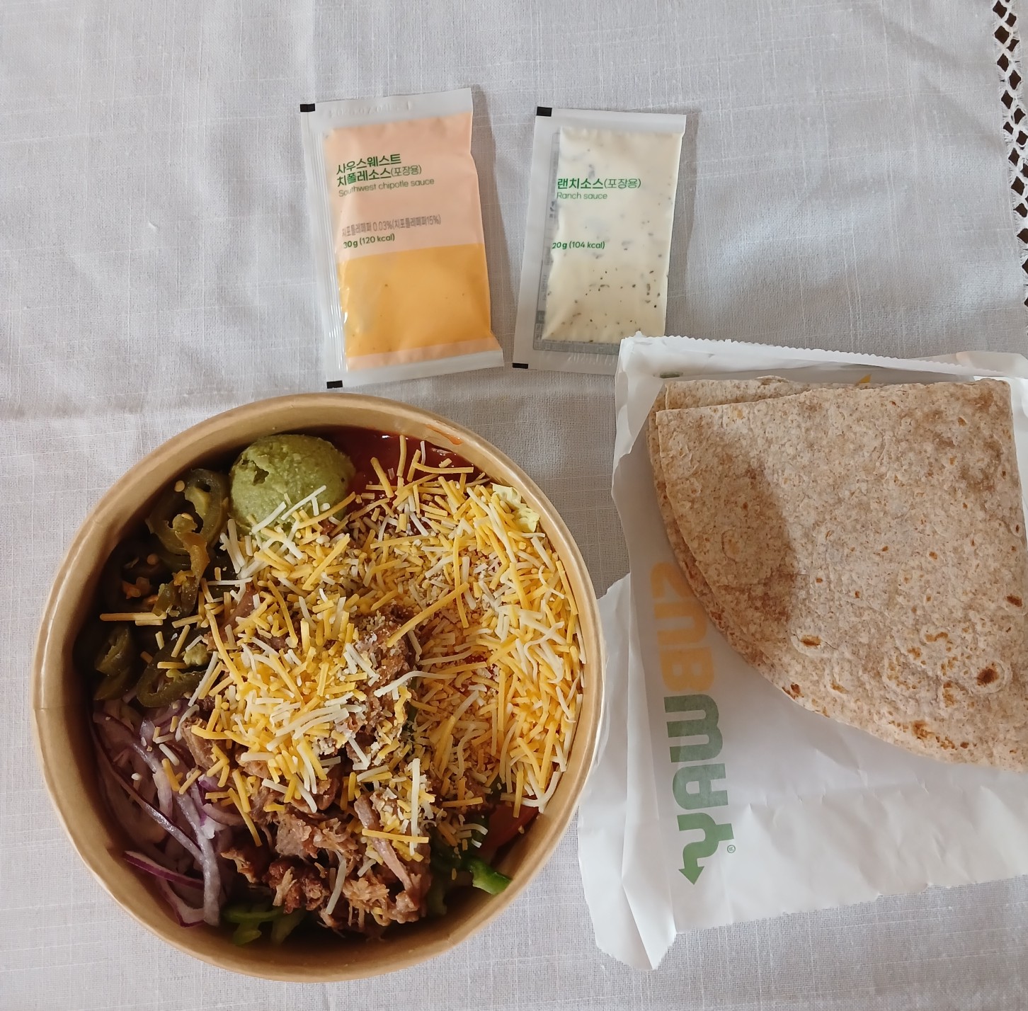 써브웨이 타코 샐러드 주문할 때 또띠아는 최대 2장까지만 추가가능하고 한 장 당 600원씩 추가 금액이 붙어요!