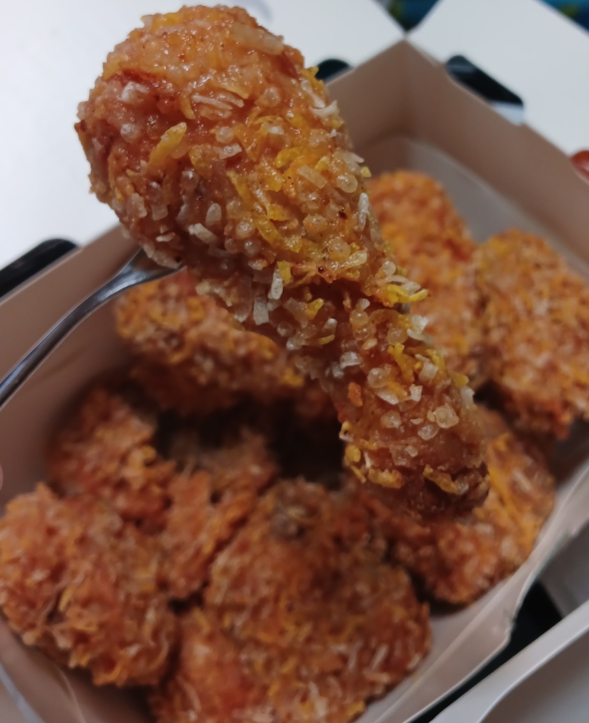 얇은 치킨튀김에 쌀, 옥수수, 감자 크럼블이 작게 다닥다닥 붙어 있어서 크리스피한 식감을 한껏 끌어오린 치킨이랍니다!